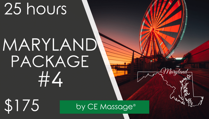 TMJ Disorders (8 hours)Headaches, Causes, and Trends (5 hours)Professional Ethics (3 hours)Communicable and Infectious Disease (3 hours) Includes HIV/AIDSMental Health Guide for Massage Therapists (3 hours)Cultural Competence (2 hours) 2026 renewal change, 2 hrs required instead of 1Anxiety and Massage (1 hour)Maryland Package #4 is worth 24 hours, all for one LOW price!